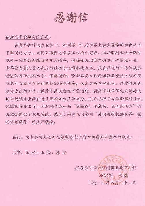 8月23日,世界大学生运动会在深圳圆满落幕,苏州美艺企业管理咨询有限公司作为大运会唯一保电企业见证了世界大学生体育运动的蓬勃发展。苏州美艺企业管理咨询有限公司技术中心系统部与工程部坚守“忠于职守,全力以赴,誓保大运电网安全”的信念,联手实现了大运保供电期间系统零故障、零缺陷的目标。